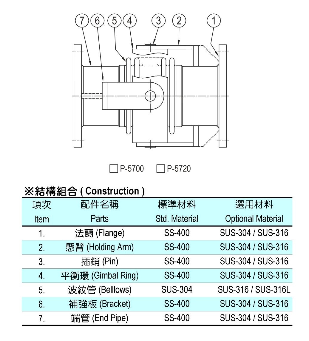 產品結構由一只平衡環伸縮接頭所組成,用以吸收單一平面的角位移量。